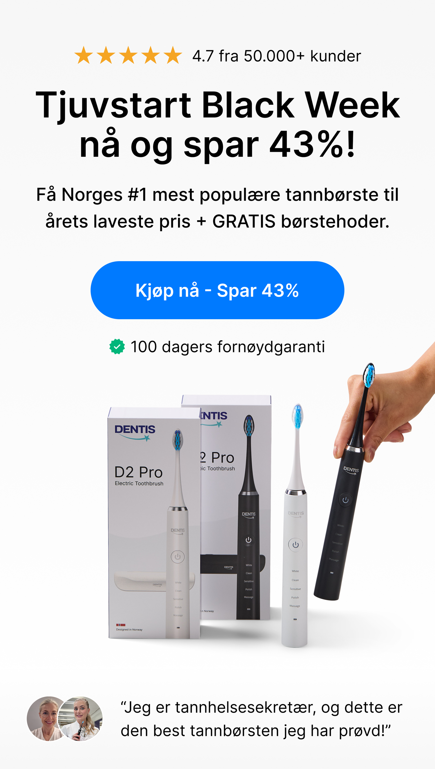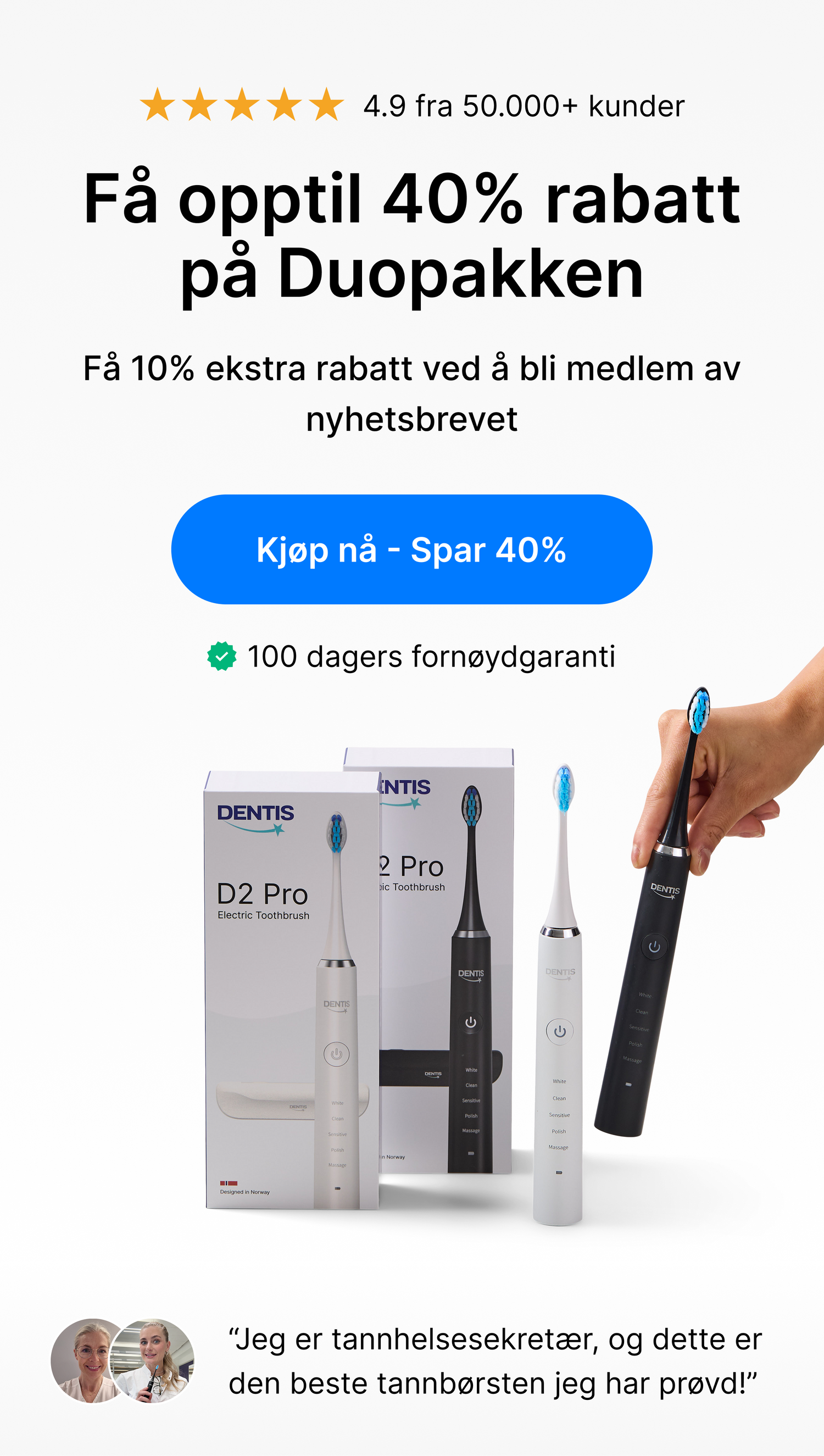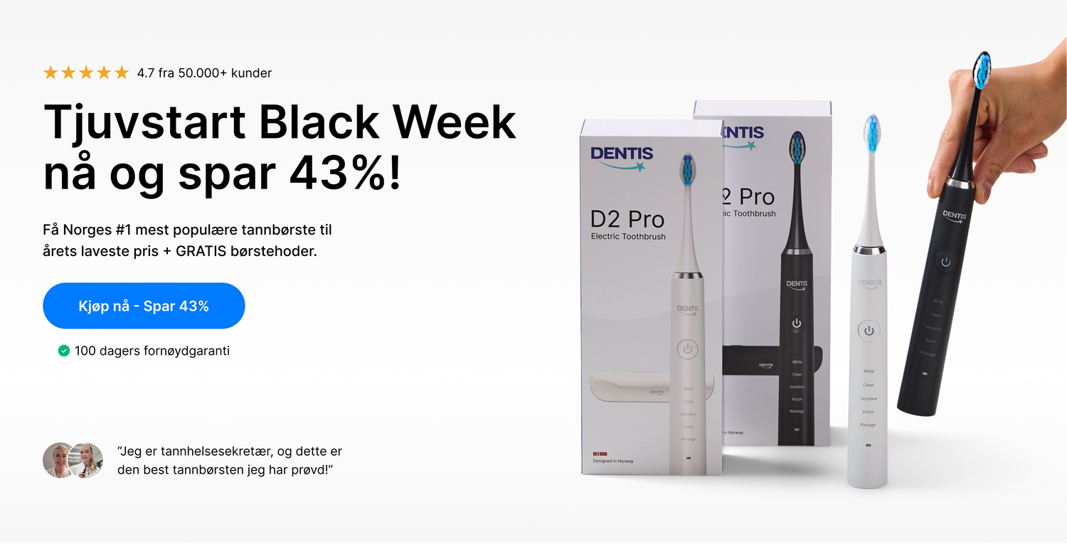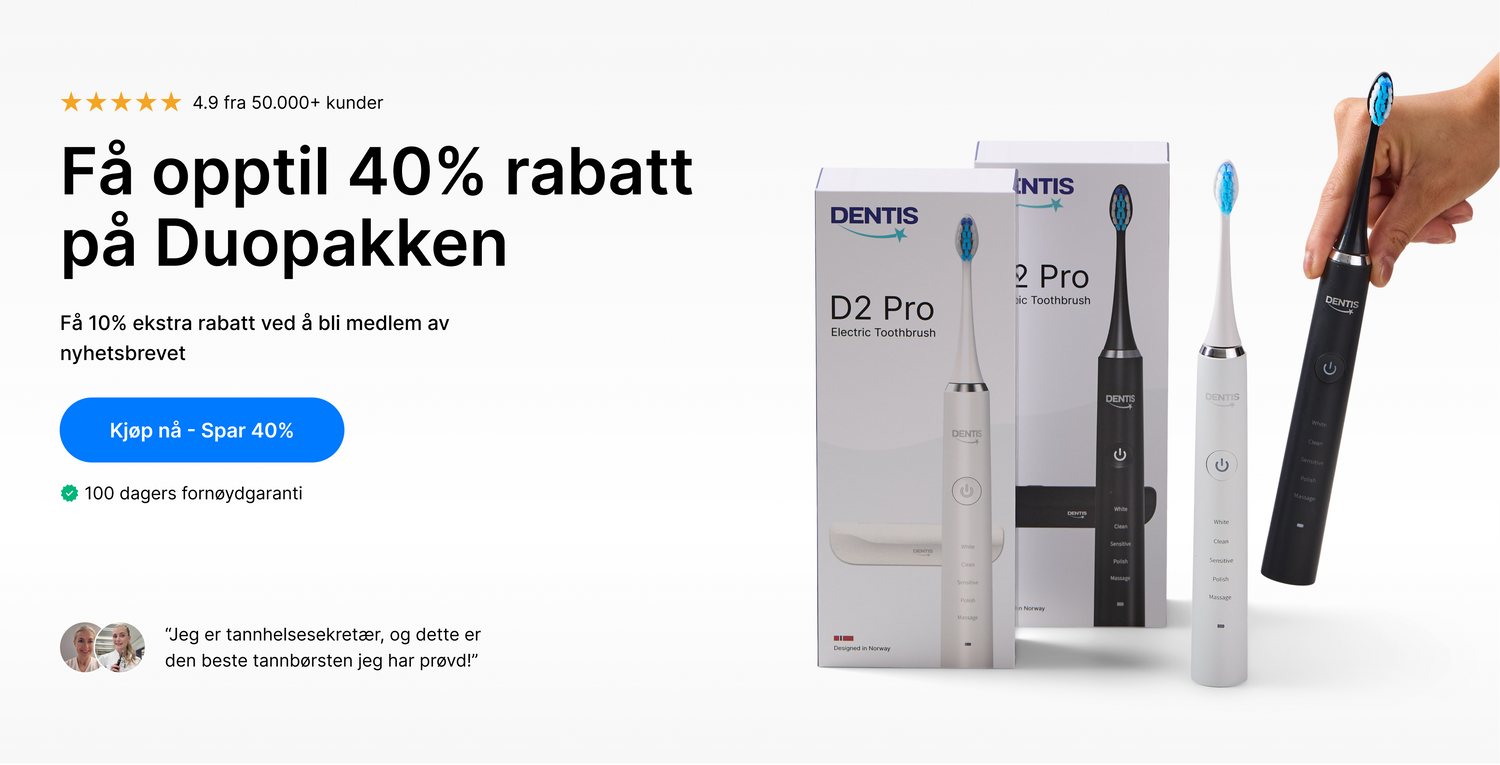 "Eg og min mann er super fornøgde. Etter berre et par dagar såg vi forskjell på både reinere og kvitere tenner, samt den tar også bort tannstein og misfarging!"