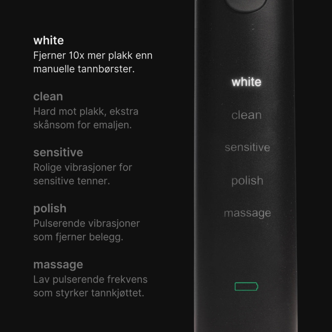 Lindrende pleie for sensitivt tannkjøtt? Dyp rengjøring av tannstein? Effektiv fjerning av misfarging? Med 5 unike moduser å velge mellom, tilpasser du enkelt tannpleien til dine behov med kun et knappetrykk.